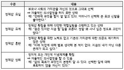 (3) 자아정체감의 4가지 수준 분류(Marcia, 1976)