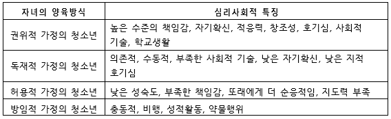 · 복종과 순응에 높은 가치를 둠 · 벌을 가하며, 물리적인 훈육방법을 선호하는 경향이 있음